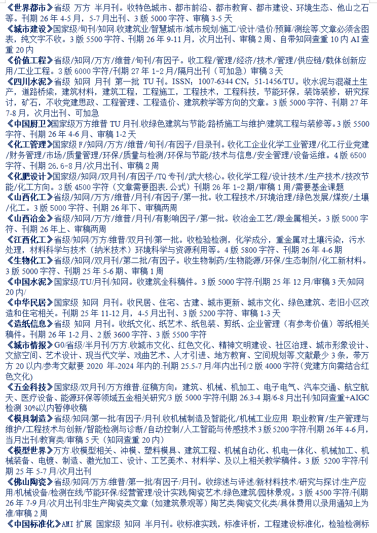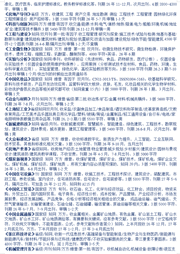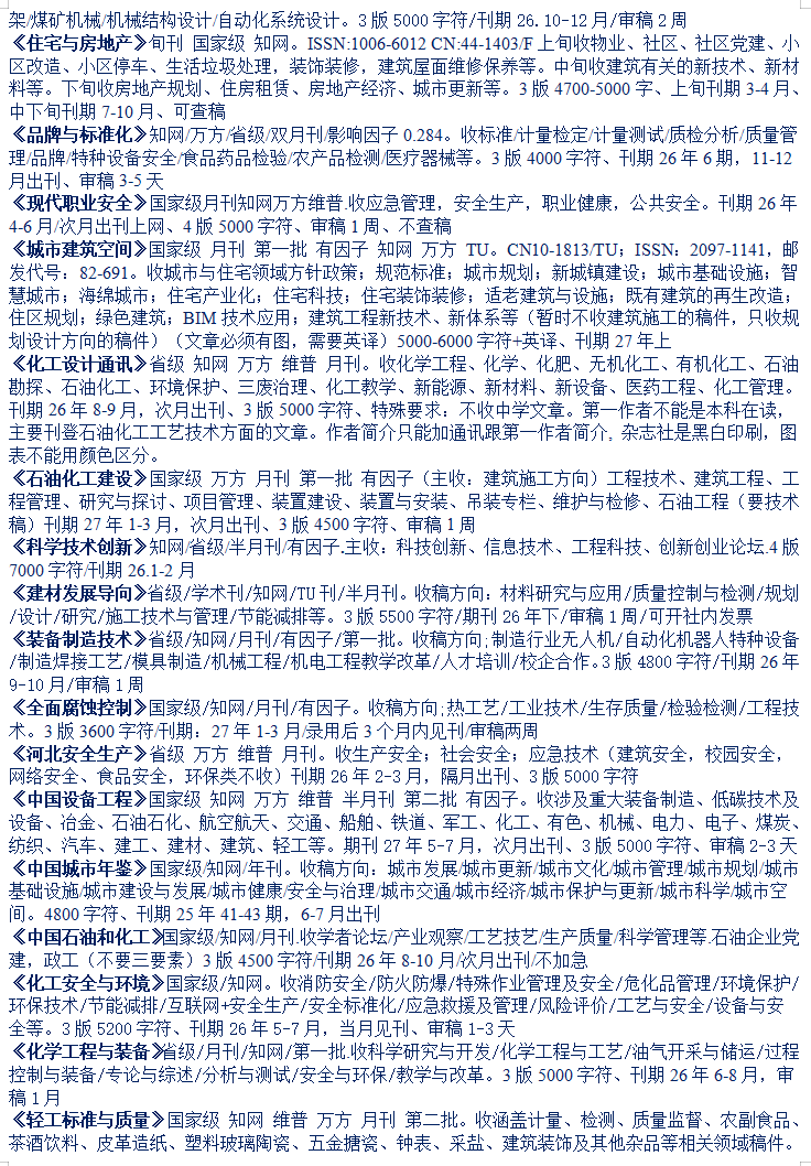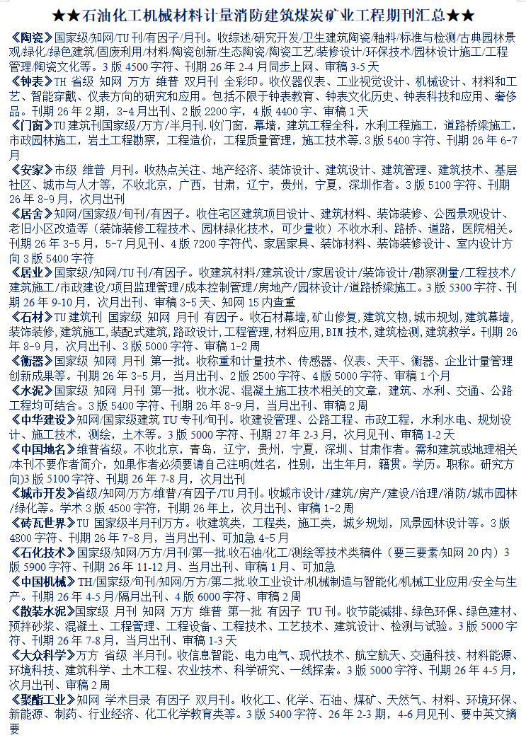26-27年石油化工机械材料计量消防建筑煤炭矿业工程期刊汇总